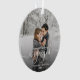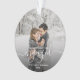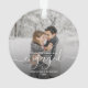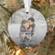 Commemorate your engagement with this beautiful modern keepsake ornament. The white text reads "Our first Christmas engaged," with the word "engaged" in elegant handwriting script with flourishes before and after. Replace the sample image with your favourite photo, and add your names and the year. A dark gradient filter helps make the text pop.