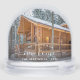 Commemorate your first Christmas in your new home with this beautiful modern keepsake snow globe. The white text reads "First Christmas in our new home," with the words "new home" in elegant handwriting script with flourishes before and after. Replace the sample image with a photo of your new house and add your family's last name. A dark gradient filter helps make the text pop.