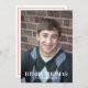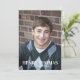 This design features a graduation photo announcement card, graduate picture invitation, with the class of your year script, classic calligraphy typography font, a modern trendy stylish, for an elegant grad party, high school or college commencement, a simple crimson and gold, senior invite, with 1 photo full bleed edge template