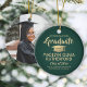 Commemorate the graduate's achievement with a custom photo green and gold round graduation Christmas ornament. Picture and all text are simple to customize. Include any favorite inspirational quote, motivational saying, school name and degree, congratulations, thanks mom and dad, or other message of your choice. TO CHANGE BACKGROUND OR TEXT COLORS, SEE INSTRUCTIONS BELOW. Design features a green background, gold faux foil graduation cap, personalized modern typography name, school, & class year, and one photo of your choice, such as a senior picture or image from the commencement ceremony. Please note that gold is printed color, not metallic foil. Makes a thoughtful keepsake gift idea and an elegant addition to Xmas home decor. Congratulations to the graduate!