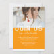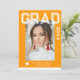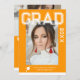 Photo Graduation Party Elegant Modern Script Invitations feature your favourite photo with the simple white text "Grad (year)" and your name and personalised graduation details on the front on a deep yellow orange background. On the reverse add an additional picture with your graduation invitation information below. Personalise by editing the text in the text boxes provided. Created by ©Evco Studio www.zazzle.com/store/evcostudio