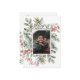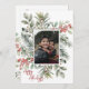 One photo frame holiday card created with watercolor pine boughs & holly berries on a clean white background for the most beautiful holiday card for all your family & friends. Happy Holidays greeting on the front to & Happy Holidays You & Yours script. Just lovely. Add your family names to personalise.