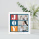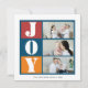 This photo holiday card features a bright colour photo frame with a combination of red, navy blue and orange colours and the inscription joy. The back side of this card features red and navy blue strip. Upload your favourite photos, sign your last name and you're done!