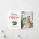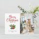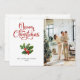 Custom photo Merry Christmas card featuring an elegant script font and holly with berries on the front and snowflakes at the back. Easily personalise this modern holiday card with your photo and text.