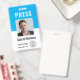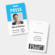 Personalise these vertical press pass badges with journalist or reporter photo and name, along with two lines of additional custom text for title or role, media outlet, or valid through date. Customise with company or media outlet logo. PRESS appears at the top in bold white lettering. Additional custom text field located on the back for return information or other details, as well as a template for a barcode or a QR code.