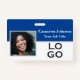 This custom identification badge features a sample photograph to the left of a name and job title, over a blue background. A sample company or business logo is placed in the bottom right, which you can replace with your own custom logo or other image. The back of the photo ID badge contains contact details and additional information.