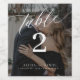 Elegant bold typography script simple modern black and white text dark overlay bride and groom names and photo personalised wedding table number wine labels. +++++++++ Please note that there are 6 labels in one set and to order different numbers you need to customise multiple sets and put them in the shopping cart one by one (one set with no 1, another with no 2, etc).