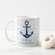 Enjoy your cup of coffee in this nautical-themed set featuring a navy blue anchor. Design has a weathered white wood background. Mug can be personalised with a monogram and name or phrase on one side, and a large photo on the other side.