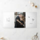 Modern simple minimalist handwritten calligraphy names trendy white all in one tri fold budget wedding invitation template with 2 photos, rsvp, and details and with scanning QR codes (automatically generated with your web address) featuring a chic white script over a transparent overlay. ++++++++++++ Easy to personalise with one or two custom photos (you can upload the same photo on both sides) and guest information! The invitation is suitable for classic formal minimal contemporary weddings.