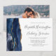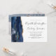 The left-hand edge of this elegant modern wedding invitation features a navy blue watercolor agate border trimmed with faux gold glitter. The customisable text combines charcoal grey handwriting, copperplate and italic fonts on a white background. Easily replace the sample image on the back with your own horizontal photo.