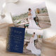 Send your family and friends a special wedding thank you with these custom photo cards. A vertical photo appears on the right half. On the left, the words "Thank You" appear in elegant gold-coloured handwriting script typography on a navy blue background over a brief, editable message of thanks to your wedding guests in copperplate font, with your names below. A gold faux glitter border decorates the left edge. The reverse side provides space for a second, horizontal photo.