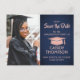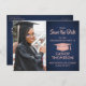 Share the joyful news of your upcoming graduation party as well as a picture with these modern navy blue and pink rose gold save the date postcard invitations. Photo and all text are simple to customize. Design features rose gold faux metallic foil graduation cap, hand written style script calligraphy, modern minimalist typography graduate name, class year and school, and a photo of your choice, such as a senior picture or image from the commencement ceremony. Please note that rose gold is printed color, not metallic foil. This elegant graduation announcement card is a stylish and chic way to begin your special day celebration.