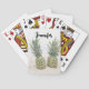 Playing cards with a photograph featuring a pair of pineapples sitting on a sandy beach.
