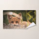 Towel set with a darling photograph featuring a little orange fox peering at you from behind a log out in the wilderness.