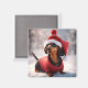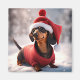 Photo of a cute dachshund with a Christmas hat, wearing a red coat, sitting in the snow. AI generated. You can easily exchange the photo with a photo of your own pet. This is the perfect gift for any dog loving person!