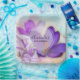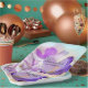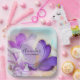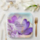 Paper plates with a lovely photograph of a dark purple crocus set inside a glass jar. A light purple blossom is present in the background.