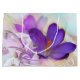 A gift bag with a lovely photograph of a dark purple crocus set inside a glass jar. A light purple blossom is present in the background.