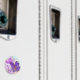 A magnet with a lovely photograph of a dark purple crocus set inside a glass jar. A light purple blossom is present in the background.