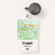 Personalised name tag with a fresh and summery photograph featuring a collection of wild daisies with big yellow centres growing in a green field.