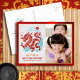 “Happy New Year” real gold foil typography in both Chinese and English, a stunning visual of a graphic multi colour cut paper and real gold foil dragon, clouds and stars, your names, and the photo of your choice overlay a traditional Asian light grey circle pattern and faux red and real gold foil border on the front. On the back are a colourful cloud and star visual, your personalised note, and return address. Feel the warmth and joy of the holiday season whenever you send this stylish yet modern, personalised 2024 Chinese Lunar New Year of the Dragon real gold foil photo postcard. Make sure someone special receives this greeting!