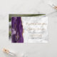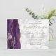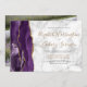 The left-hand edge of this elegant modern wedding invitation features a purple watercolor agate border trimmed with faux gold glitter. The customisable text combines black and gold-coloured handwriting, copperplate and italic fonts on a grey and white marble background. Easily replace the sample image on the back with your own horizontal photo.