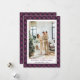 Cute purple buffalo plaid photo Christmas cards featuring falling snow on a black and purple buffalo plaid background. Easily personalise this modern photo Christmas card with your favourite photo and the family name.
