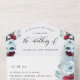 Delight your guests with this elegant floral All-in-One photo Wedding invitation with perforated RSVP. Environmentally friendly invitation as there is no need for extra insert cards, RSVP cards or RSVP envelopes, this invitation has it all! Ability to add both Wedding Ceremony and Reception details, as well as RSVP postcard ready for guests to fill in and mail! Captivating design with cascading blue watercolor stain and exquisite watercolor flowers in a beautiful blend of dusty blue, navy, mist, red and burgundy tones. Modern hand written calligraphy details. Ability to add your own photograph on the back. Same invitation design with area for printed (or hand write later) guest name or a phrase on the back, instead of photograph, also available. Striking design ideal for the elegant, yet practical and eco-friendly couple!