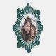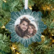 Pine green, snowflake shaped Christmas ornament card featuring your custom photo inside a retro sunburst border. Customisable text on the back.