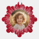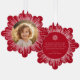 Red, snowflake shaped Christmas ornament card featuring your custom photo inside a retro sunburst border. Customisable text on the back.