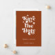 Modern Retro Typography Photo Wedding Announcement Flat Card. With a modern retro typography "save the date" over a terracotta brown background on the front, with names and date in a simple and minimal design, add your wedding website for event details. Add a photo of the couple along with text template for a wedding website or details. Choose prints and/or a digital announcement download.