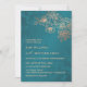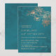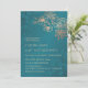This elegant wedding invitation features rose gold line art flowers on a teal/ peacock green background.