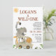 Cute safari themed boy's first birthday invitation featuring various cute jungle animals, a bus, sun and some jungle foliage. This wild one birthday invitation can be used for any age and is deal for a safari themed birthday party. Your little boy's photo appears on the back.