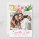 Tropical palms watercolor floral photo save the date card, with a very light peri wash textured background. Customise names, dates, and information.