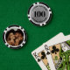 These custom poker chips feature a bold number on the front, which can be personalised with any number up to four digits. The front has a faux metallic silver background paired with crisp black fonts for a sleek, modern, and striking look. The back includes space for a photo, making them perfect for weddings, man caves, bachelor parties, or as a memorable gift. All text, numbers, and details can be fully customised to fit your style or event theme.
