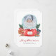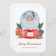 Photo Snow Globe Holiday Card. This adorable Christmas card features a snow globe with a round picture for personalising. Cute hand-painted watercolor vintage toys and presents are around the snow globe with the year. The back had a matching nutcracker toy soldier illustration with text for personalising.