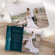 Send your family and friends a special wedding thank you with these custom photo cards. The right-hand side features a vertical photo. On the left, the words "thank you" appear in elegant silver grey handwriting script typography on a dark teal blue background over a brief, editable message of thanks to your wedding guests in copperplate font, with your names below. A teal blue watercolor agate border trimmed with faux silver glitter decorates the left edge. The reverse side provides space for a second, horizontal photo.