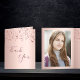 A thank you card for a milestone birthday with space for two, 2 of your own photos. A chic girly rose gold faux metallic looking background and rose gold, copper colored dripping shiny stars. On front a hand lettered style script and the text: Thank You