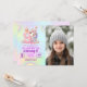 Personalized photo invite featuring a sweet unicorn illustration and pastel rainbow colors for her 9th birthday.