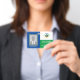 Create your own photo badge ID with this simple, versatile design. Replace the sample photo and logo with your own for a personalised design. The sample colour scheme here is green, blue and yellow, but you can change the colours of all the design elements to match your group or organisation colours. You can also change the fonts style and colours to match your logo. Great for all organisations and groups.
