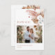 This elegant wedding thank you card in modern colors features dusty rose and blue flowers on a tropical leaves and a custom photo on a white background. Matching wedding invitation available.