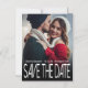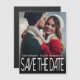 Send out a Save the Date card they won't forget. The bold graphics will get their attention and it's a magnet they can put on their fridge or file cabinet! Save the date is written in large modern and minimalist white capital letters. Your name, wedding date, and location are placed above. Easily replace the photo and text with your own wedding details.