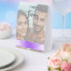 Add elegance and personalization to your wedding tables with this custom photo wedding table number, featuring a romantic couple photo with beautifully styled text elements. The top third of the design displays your table number in black calligraphy script with a white drop shadow, ensuring clarity and readability against the photo.