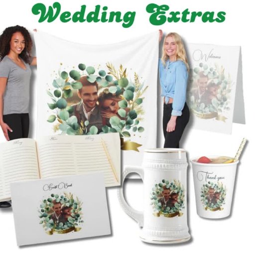 Photo and text template wedding, newlyweds, anniversary event item with a Eucalyptus, greenery leaves, with gold accents theme.