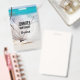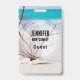 A name tag with a gorgeous photograph. Tropical blue water and foamy surf in the background. A collection of seashells and stems set on a white sandy beach.
