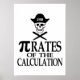 A skull with a gold tooth and eye patch wearing a pirates hat with two pens forming an "X" below it instead of the typical crossbones. On the hat is the number for "Pi" rounded to five numbers. Below the skull and crosspens is the phrase "Pi-rates of the Calculation" The letters "Pi" in the word Pi-rates has been replaced by the symbol for Pi.