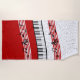 A fun music themed design for the keyboard and piano lover with curved piano keyboard and a music score design in red white and black with light grey music notes background