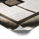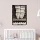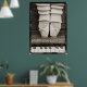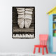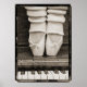 A beautiful sepia toned still life photograph of ballet shoes en pointe atop an upright piano keyboard surrounded by a graphic polaroid-style border. The large sized poster is 30 x 42 inches or 76 1/4 x 106 1/2 cm