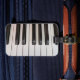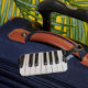 This luggage tag has piano keys pictured on it.