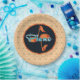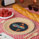 Patterned piano text overlapping two red notes in a patterned circle is a unique design for keyboard musicians in concert and jazz bands