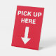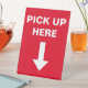 Red customer information pedestal sign with text "Pick Up Here" and white arrow. Great for food delivery couriers or to-go order customers.